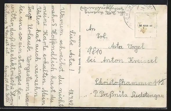 alte Ansichtskarte, gelaufen 1942, Briefmarke entfernt, guter Zustand