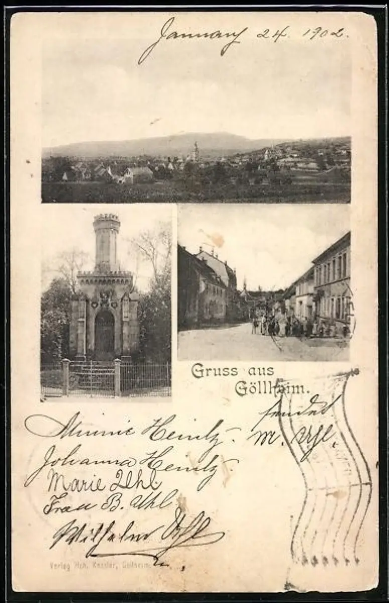 Künstler-AK Göllheim, Denkmal, Strassenpartie und Gesamtansicht