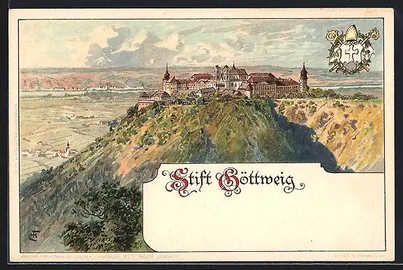 Künstler-AK Göttweig, Blick auf das Stift, das Wappen