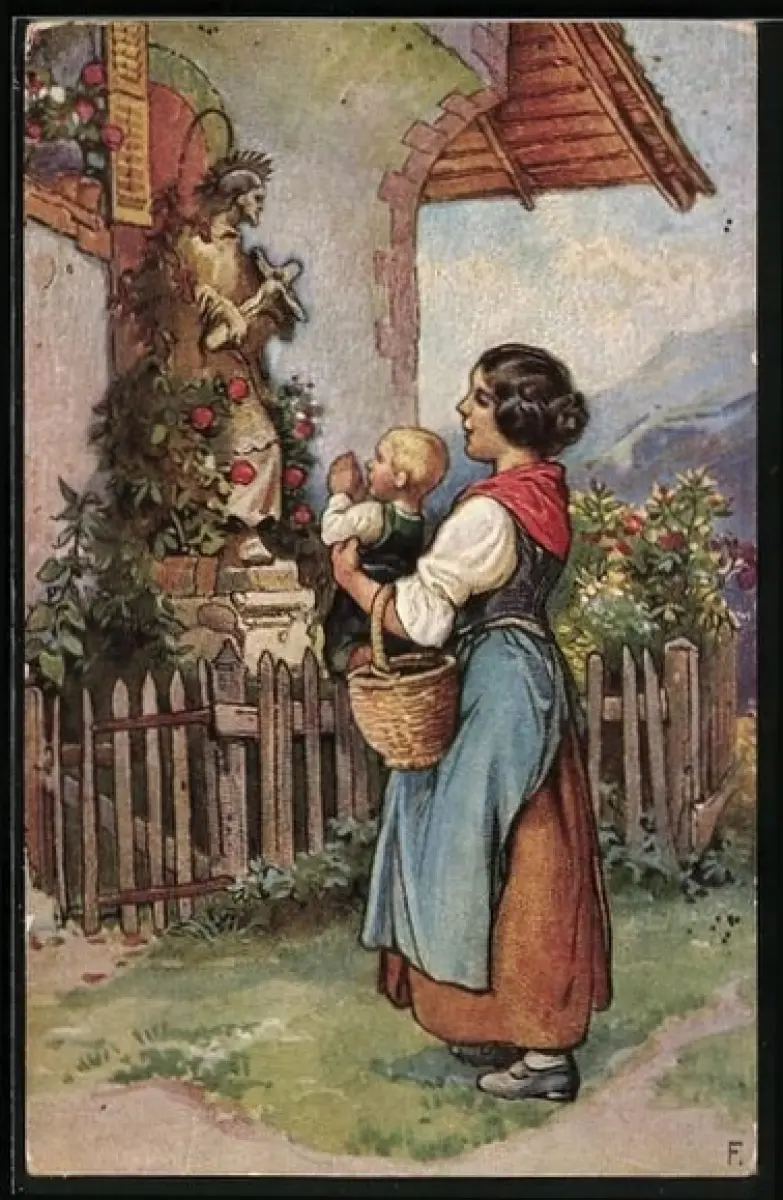 Künstler-AK Gott schütze unsere Lieben im Felde, Mutter & Sohn im Gebet am Hofkreuz