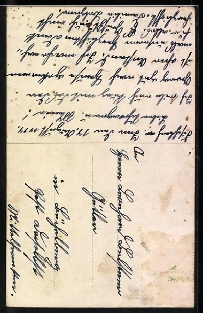 Personenbezogene Daten auf der Rückseite der Karte wurden durch blauen Textmarker unkenntlich gemacht. Die blauen Stellen sind auf die Vorderseite durchgeweicht und wirken sich negativ auf das Postkartenfoto aus