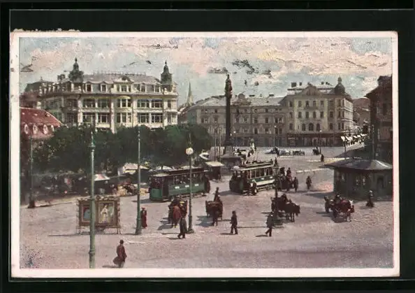Künstler-AK Graz, Jacomini-Platz mit Strassenbahn