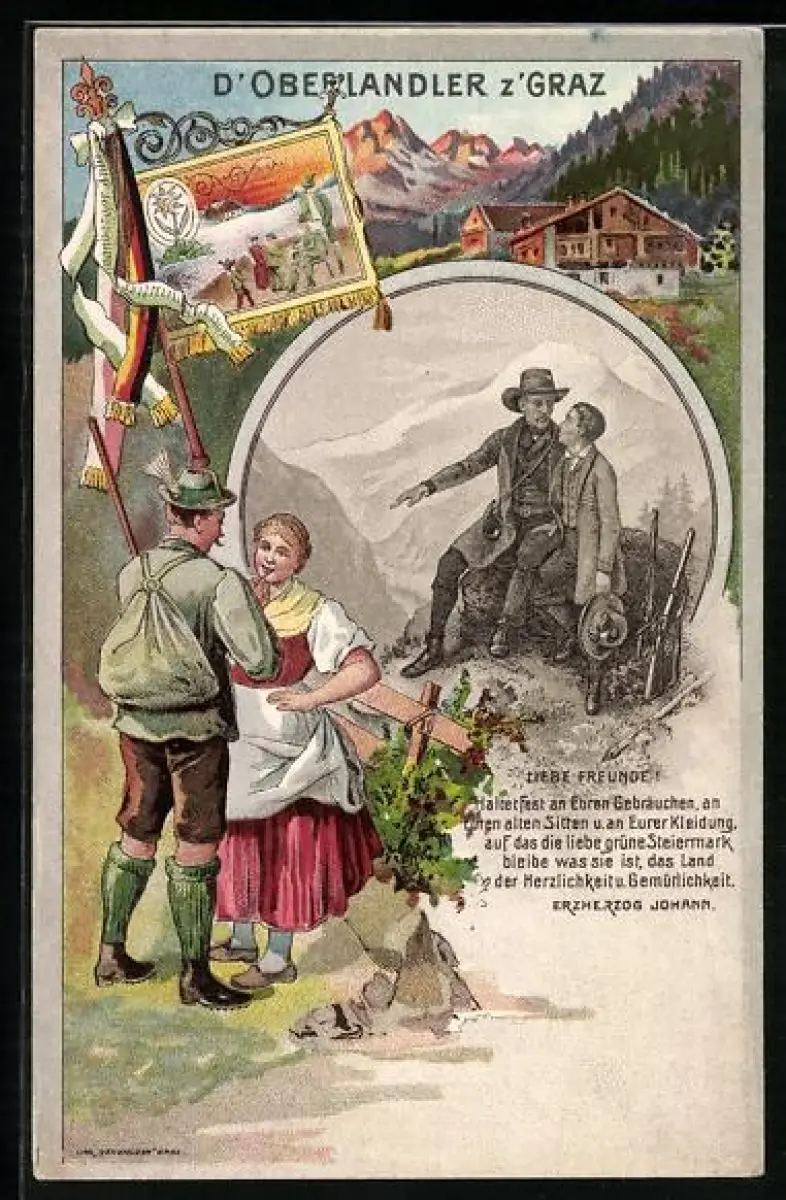 Künstler-AK Graz, Jäger auf einem Felsen sitzend, Paar in Trachten