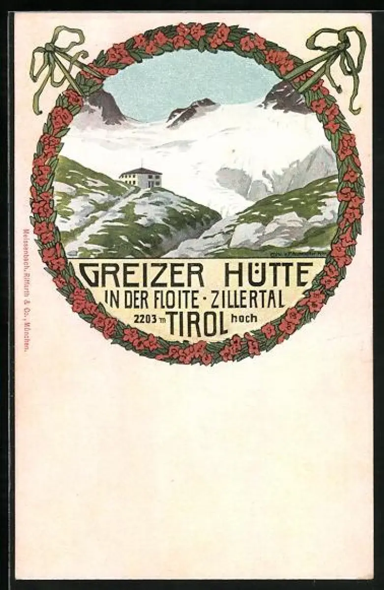 Künstler-AK Greizer-Hütte, Blick zur Berghütte in der Floite, Gletscher