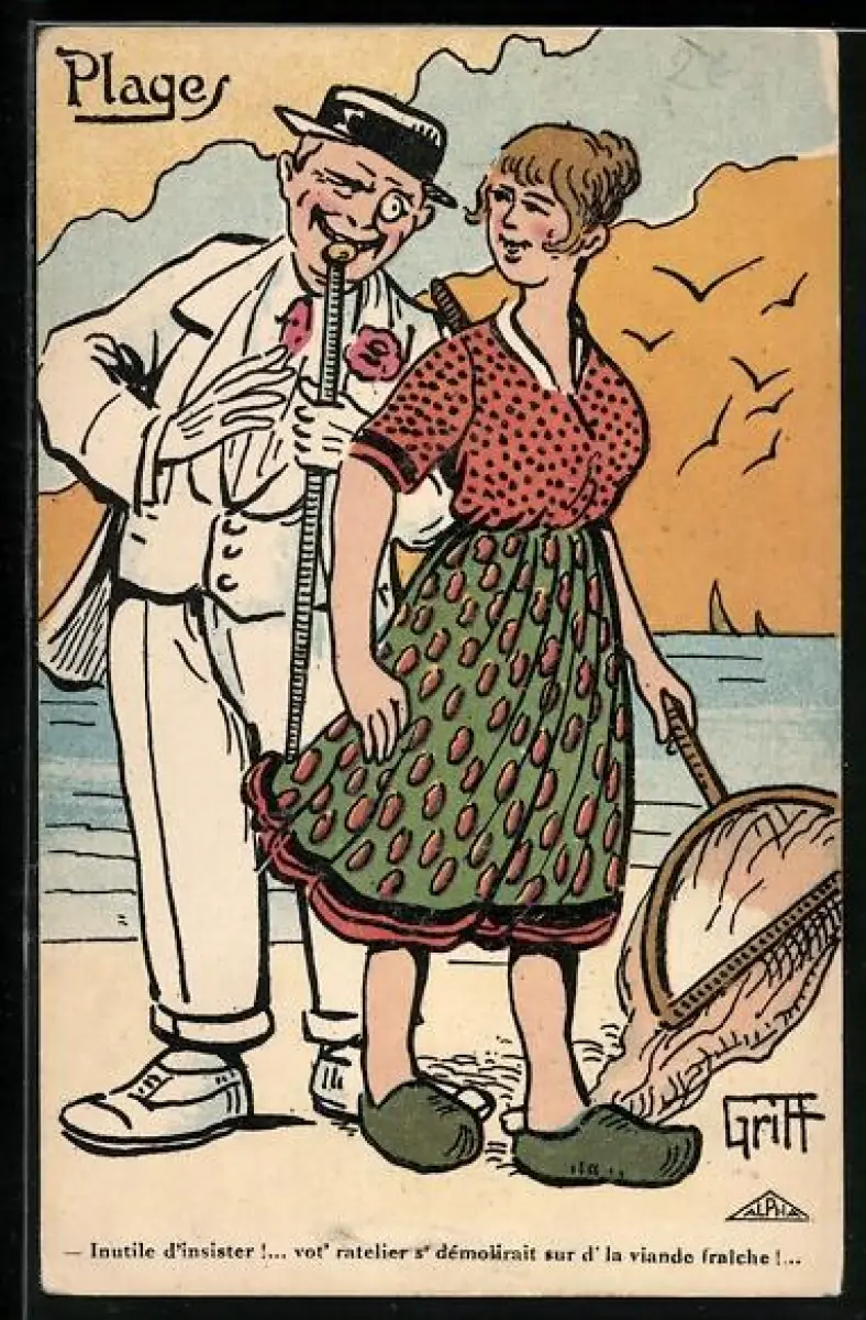 Künstler-AK Griff: Mann im weissen Anzug flirtet mit einer Fischerin
