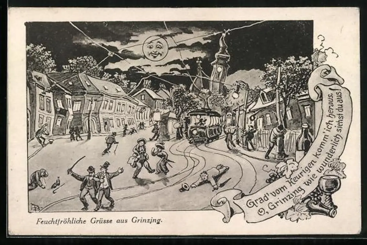 Künstler-AK Grinzing, Strassenpartie mit Strassenbahn und Wirtshaaus-Heimkehrern, aus der Sicht eine Betrunkenen