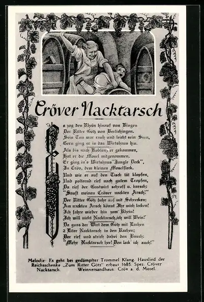 Künstler-AK Gröver Nacktarsch, Mutter versohlt den Buben, Weinfässer und -reben