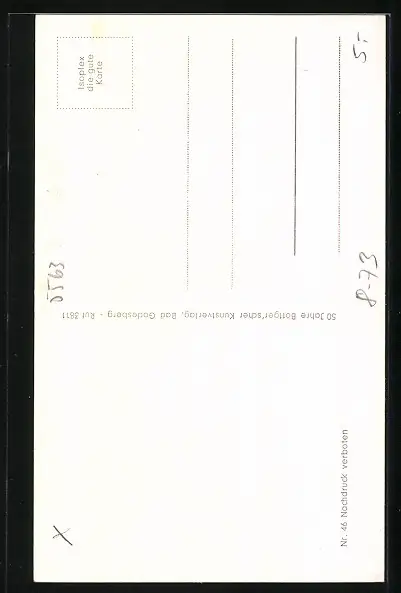 Personenbezogene Daten auf der Rückseite der Karte wurden durch blauen Textmarker unkenntlich gemacht. Die blauen Stellen sind auf die Vorderseite durchgeweicht und wirken sich negativ auf das Postkartenfoto aus