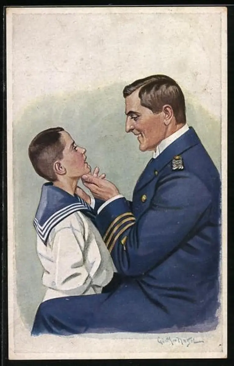 Künstler-AK Günther Nagel: Ganz der Papa (), Mann in Uniform schaut sich Knaben an