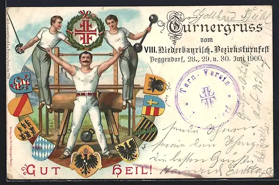 Künstler-AK Gut Heil - Turner an ihren Geräten mit Wappen