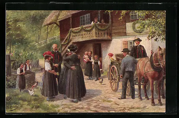 Künstler-AK H. Hoffmann: Abschied vom Elternhaus, Trachten, Pferdegepann, Hühner
