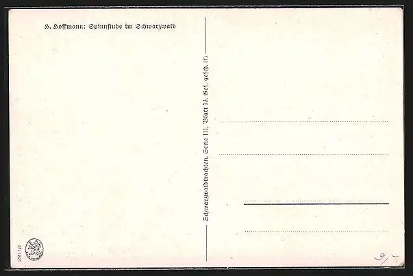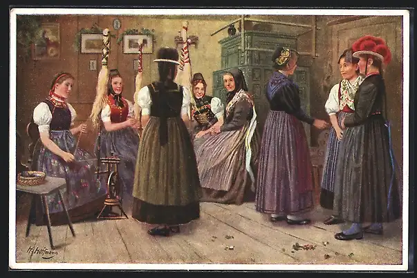 Künstler-AK H. Hoffmann: Spinnstube im Schwarzwald, Frauen in Schwarzwälder Tracht mit Spinnrädern in der Stube