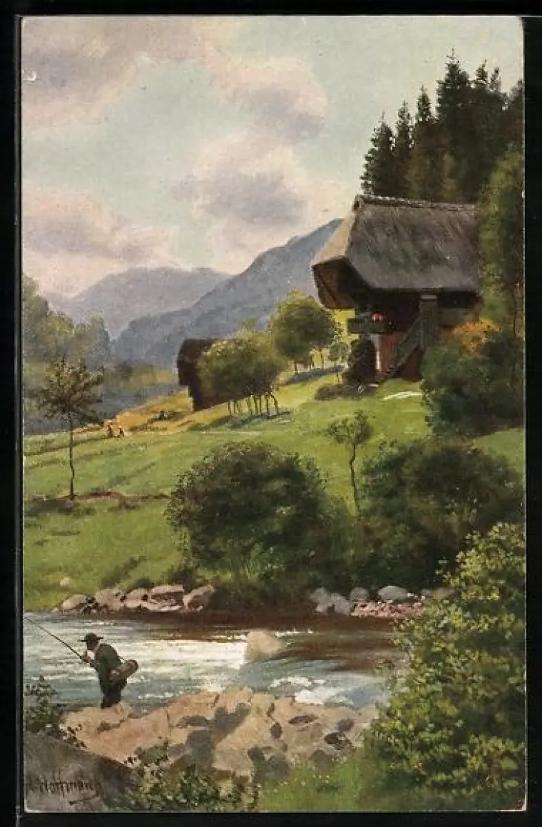 Künstler-AK H. Hoffmann: Wolfach, Hütte am Waldrand, Angler am Fluss
