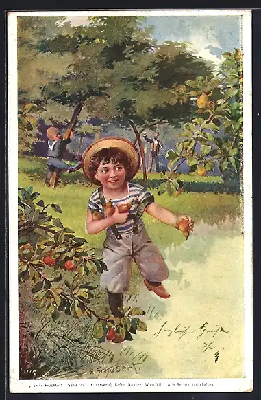 Künstler-AK H. Schubert: Junge beim Birnenpflücken
