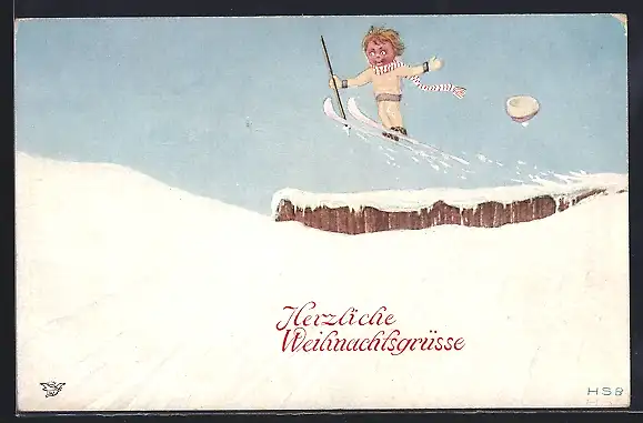 Künstler-AK H.S.B.: Frisch gewagt ist halb gewonnen, Lustiger kleiner Skispringer