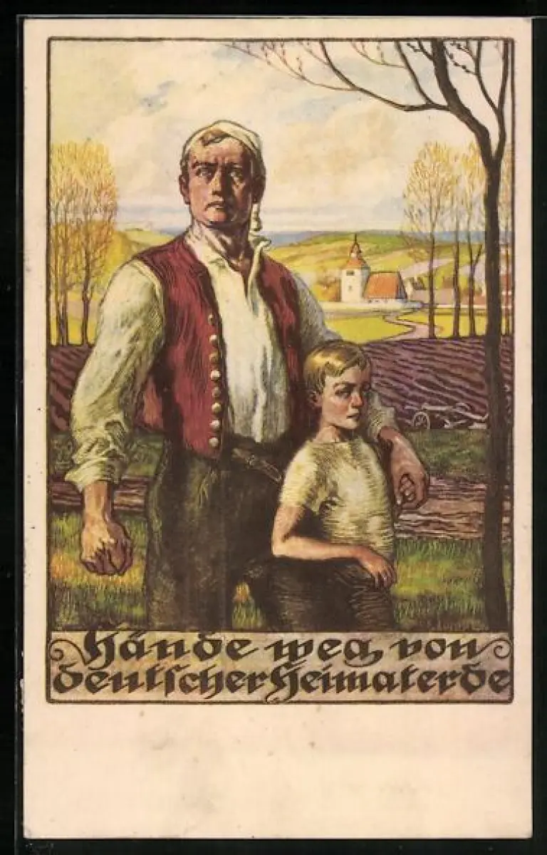 Künstler-AK Hände weg von deutscher Heimaterde, Vater und Sohn auf dem Feld, Deut. Handels- u. Industrie-Verband