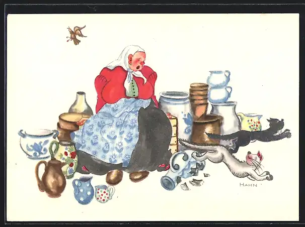 Künstler-AK Hahn: Katzen zerstören Geschirr einer Marktfrau
