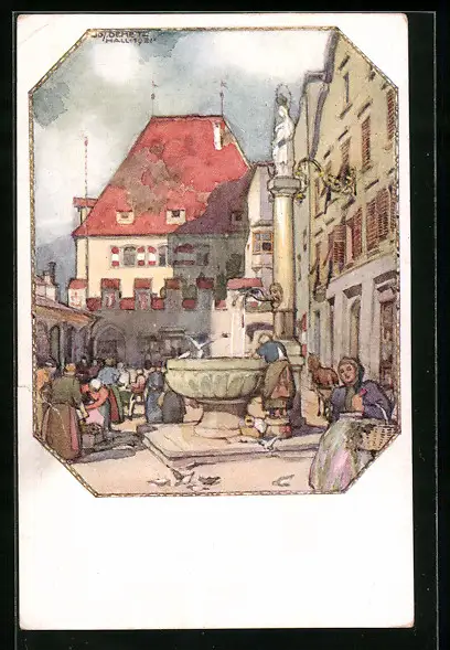 Künstler-AK Hall, Rathaus mit Brunnen