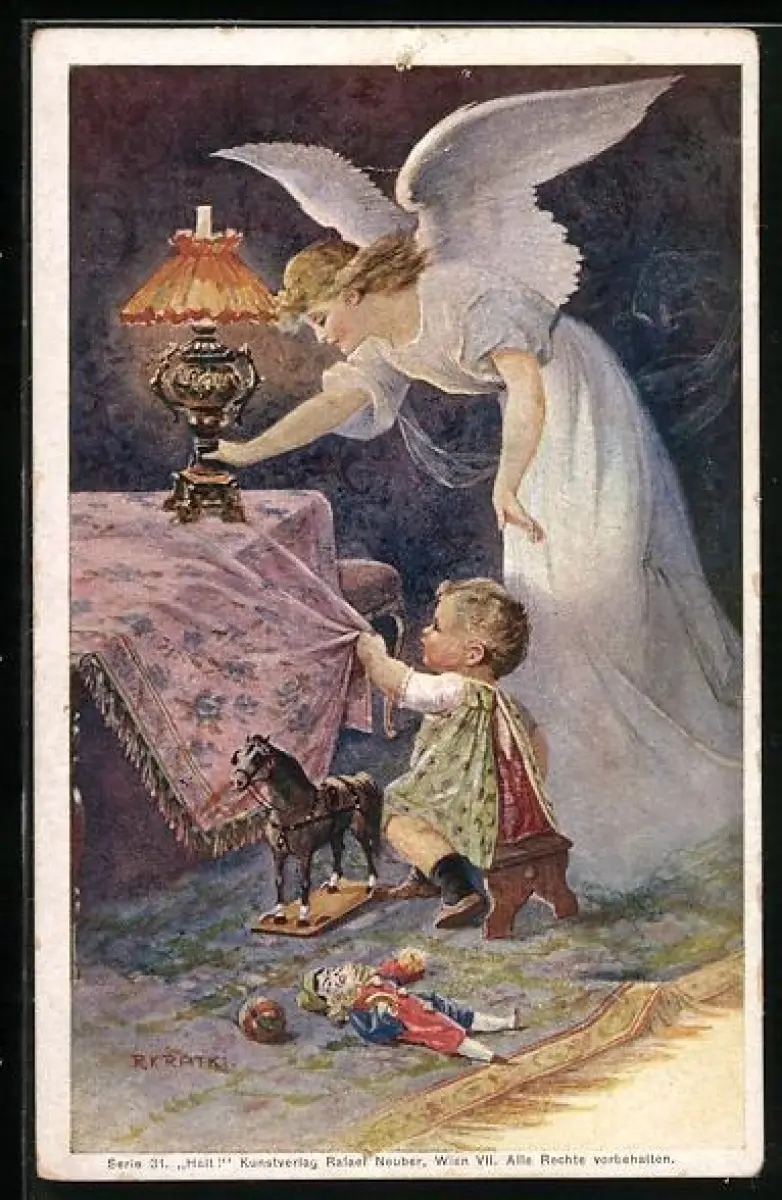 Künstler-AK Halt!, Schutzengel rettet Kind vor fallender Lampe