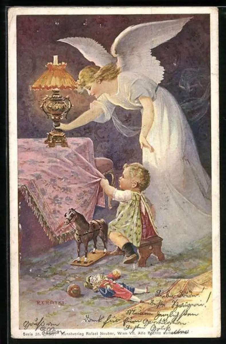 Künstler-AK Halt!, Schutzengel rettet Kind vor fallender Lampe