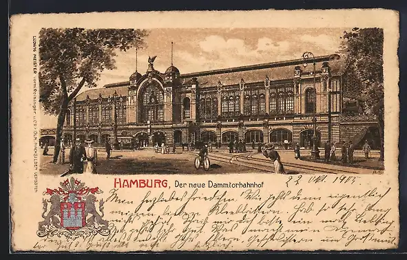 Künstler-AK Hamburg-Neustadt, Der neue Dammtorbahnhof, Radfahrer, Leute