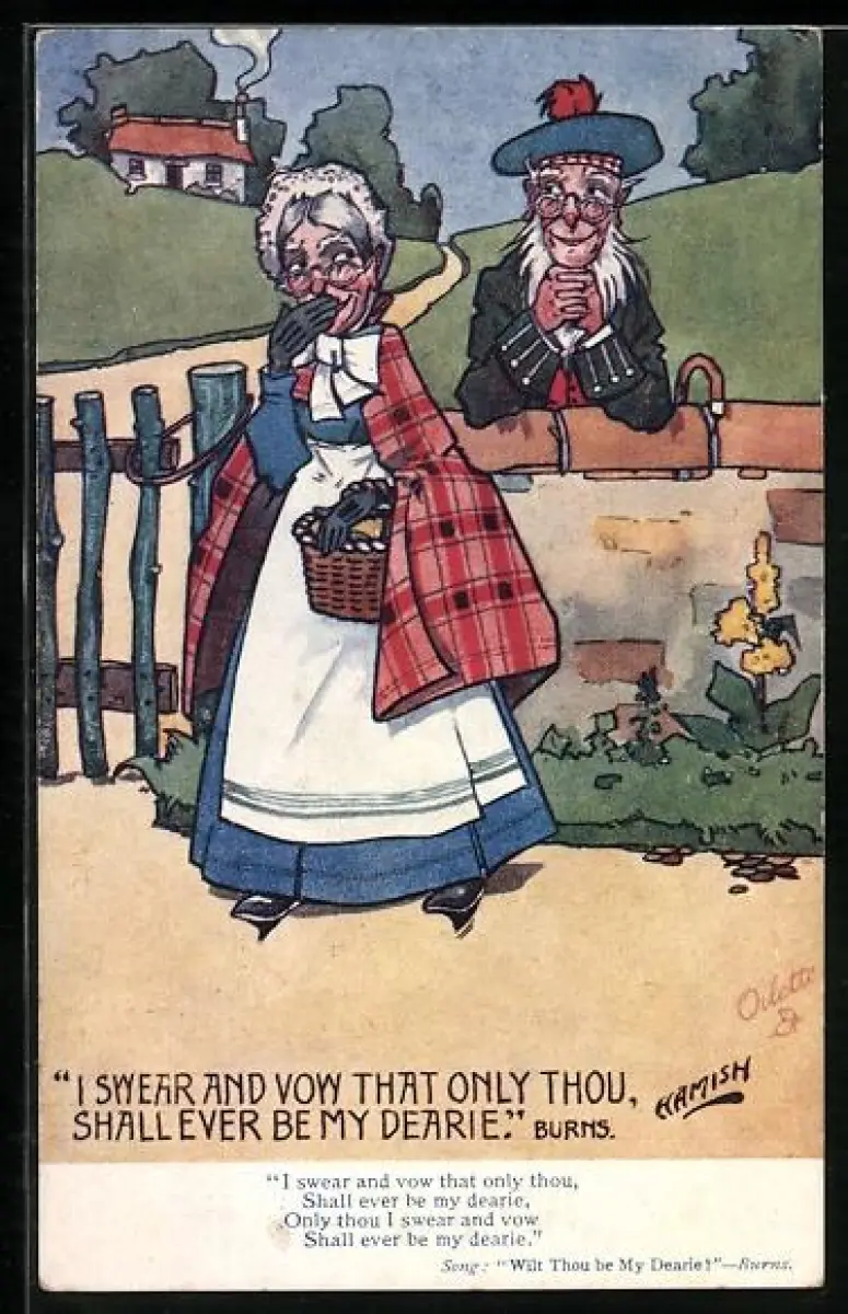 Künstler-AK Hamish: Älteres Schottisches Paar an einer Gartenmauer