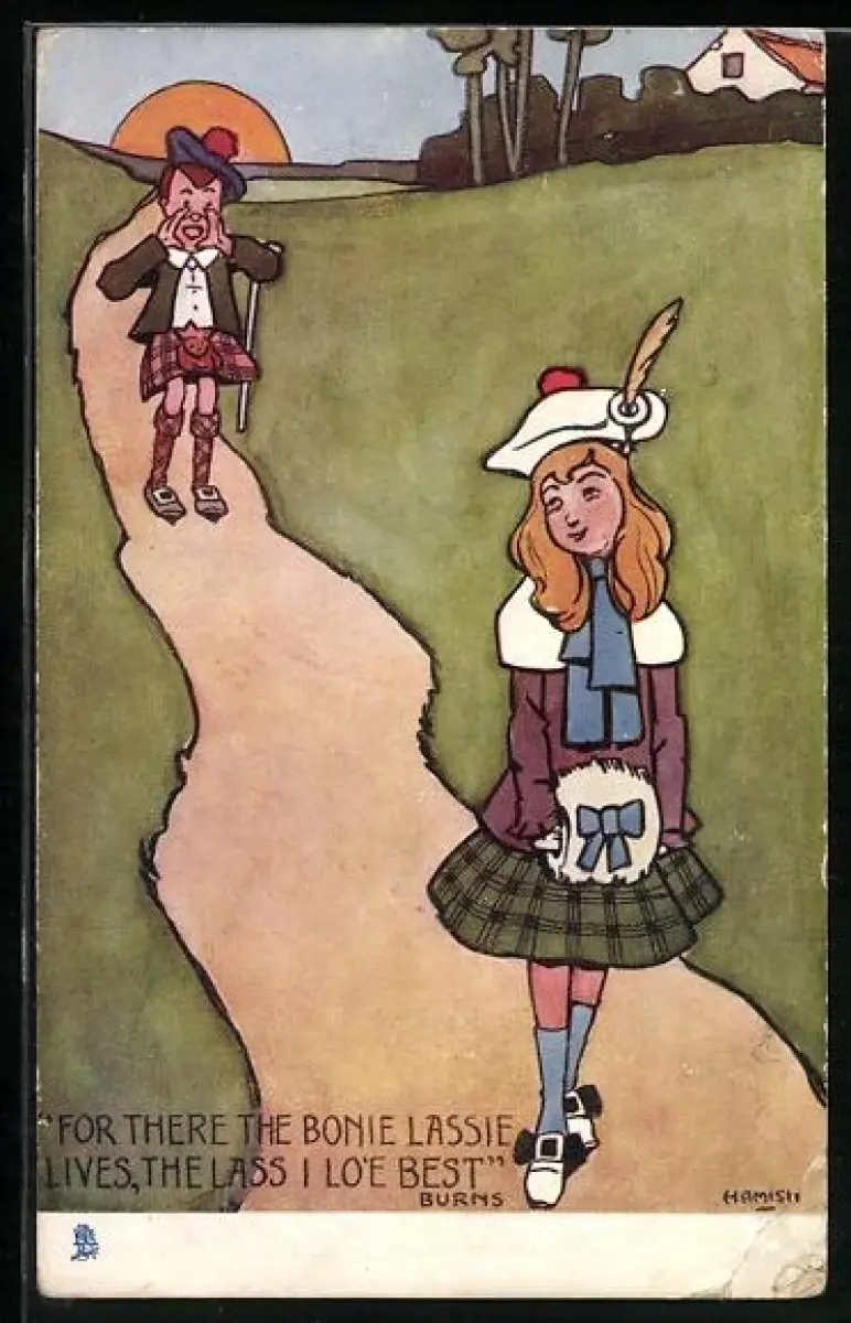 Künstler-AK Hamish: Schottischer Junge ruft einem Mädchen hinterher