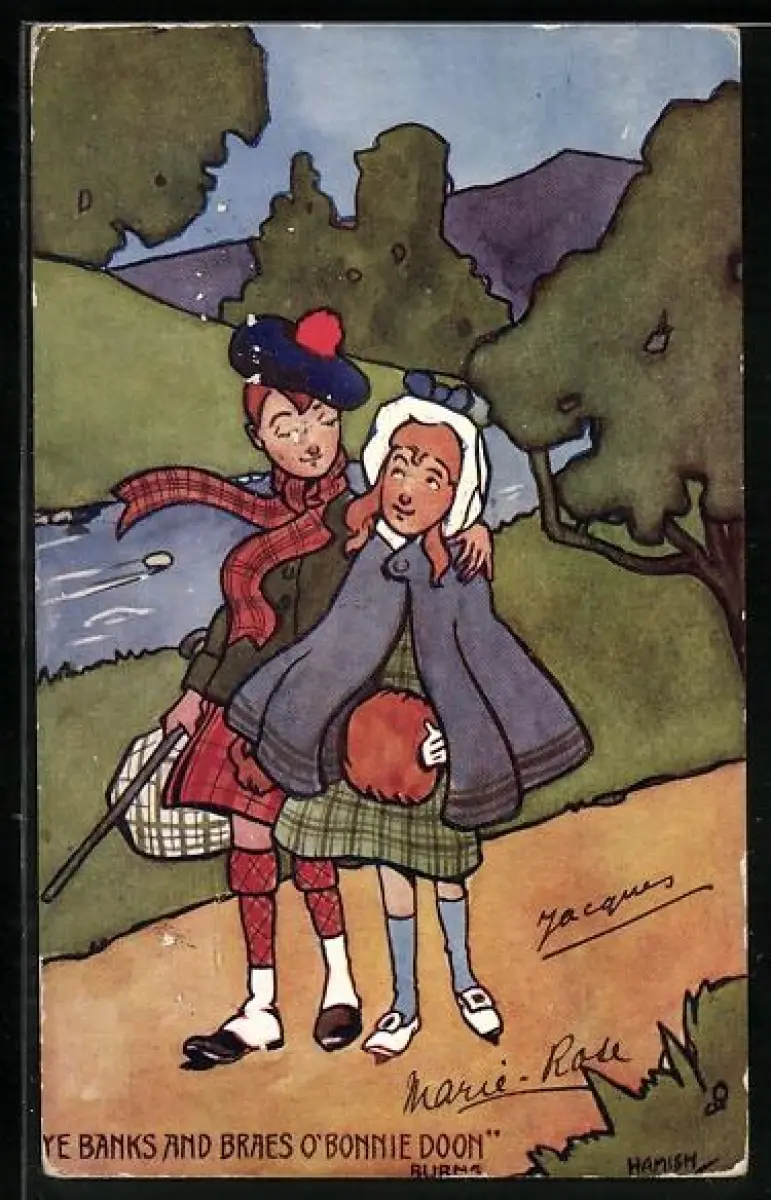 Künstler-AK Hamish: Schottisches Liebespaar spaziert an einem Fluss entlang