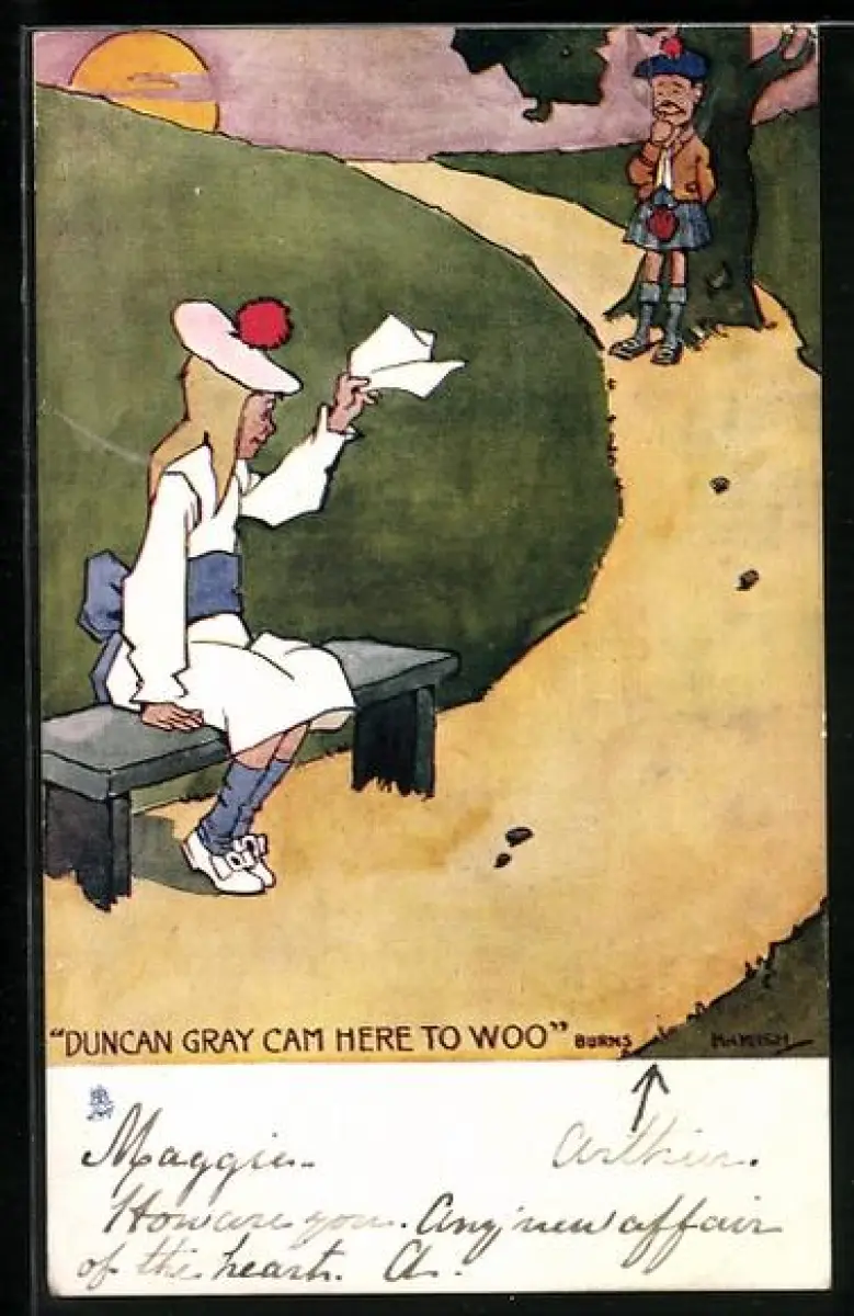 Künstler-AK Hamish: Schottisches Mädchen winkt einem Jungen zu