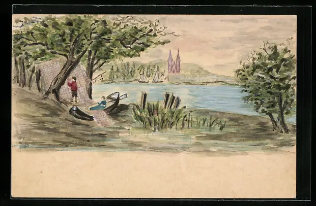 Künstler-AK Handgemalt: Fischer kontrolliert Netz