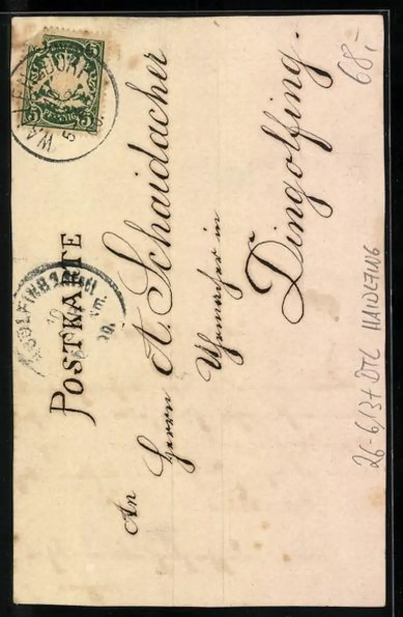 Personenbezogene Daten auf der Rückseite der Karte wurden durch blauen Textmarker unkenntlich gemacht. Die blauen Stellen sind auf die Vorderseite durchgeweicht und wirken sich negativ auf das Postkartenfoto aus