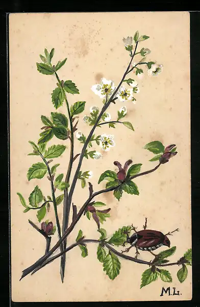 Künstler-AK Handgemalt: Maikäfer krabbelt auf einem Zweig