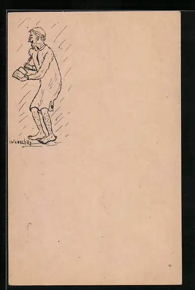 Künstler-AK Handgemalt: Mann mit Nachthemd im Regen