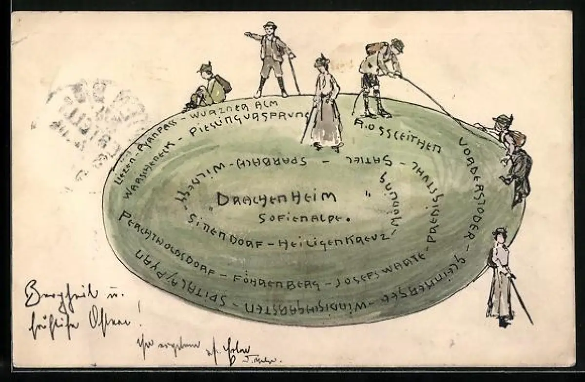 Künstler-AK Handgemalt: Mödling, Bergsteiger auf dem Weg zum Drachenheim Sofienalpe