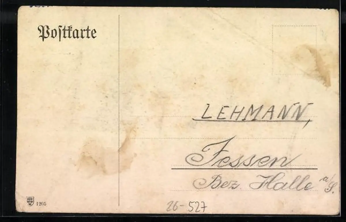 Personenbezogene Daten auf der Rückseite der Karte wurden durch blauen Textmarker unkenntlich gemacht. Die blauen Stellen sind auf die Vorderseite durchgeweicht und wirken sich negativ auf das Postkartenfoto aus