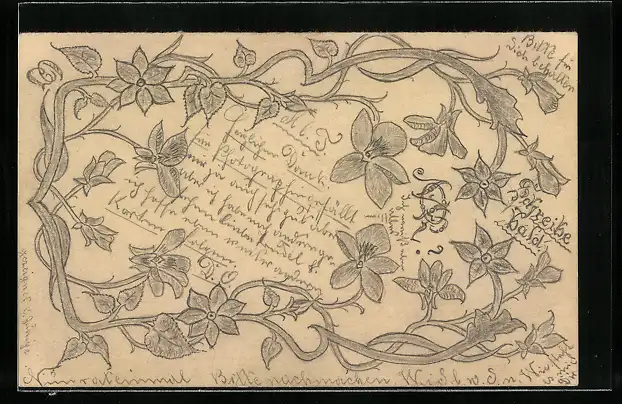 Künstler-AK Handgemalt: Schreibe bald!, Blumenmuster