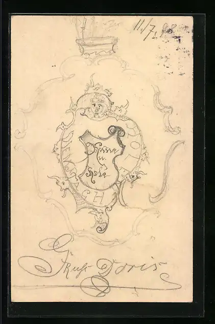 Künstler-AK Handgemalt: Wappen mit Tieren und Gesichtern