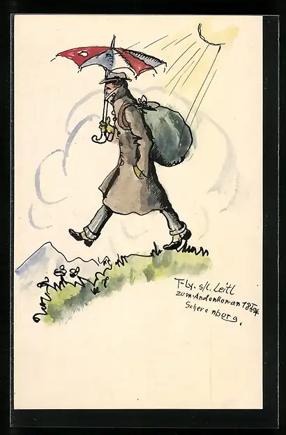 Künstler-AK Handgemalt: Weltenbummler mit zerlöchertem Regenschirm