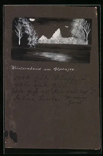 Künstler-AK Handgemalt: Winterabend am Alpensee