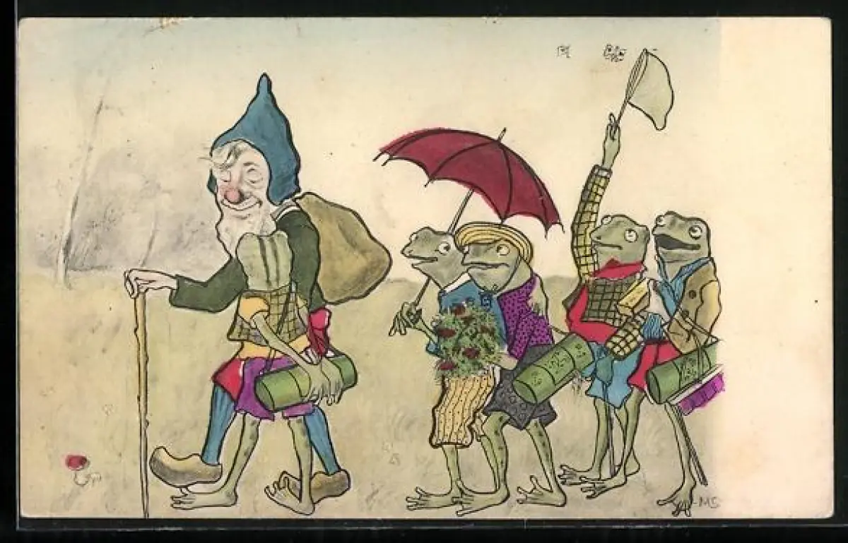 Künstler-AK Handgemalt: Zwerg geht mit Fröschen spazieren