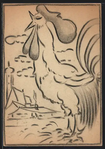 Künstler-AK Handgemalt, unsign. Franz Dworschak: Hahn weckt mit Krähen das Dorf