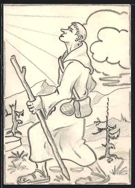 Künstler-AK Handgemalt, unsign. Franz Dworschak: Wandernder Mönch blickt zum Himmel