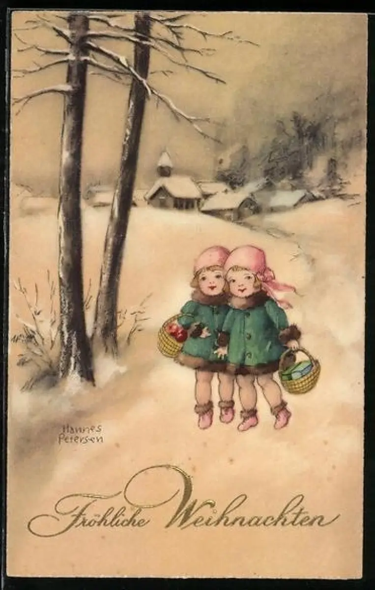 Künstler-AK Hannes Petersen: Zwei Kinder in der Winterlandschaft, Fröhliche Weihnachten