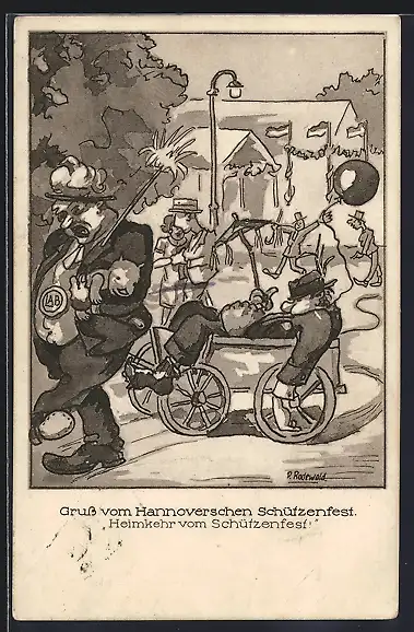 Künstler-AK Hannover, Betrunkener wird im Bollerwagen vom Schützenfest heimgefahren