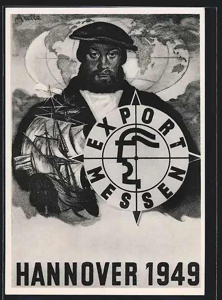 Künstler-AK Hannover, Export Messen 1949, Kapitän mit Segelschiff vor Globus