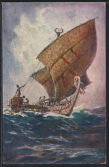 Künstler-AK Hans Bohrdt: Letztes Boot von der Insel Ugomes /Südsee auf bewegter See