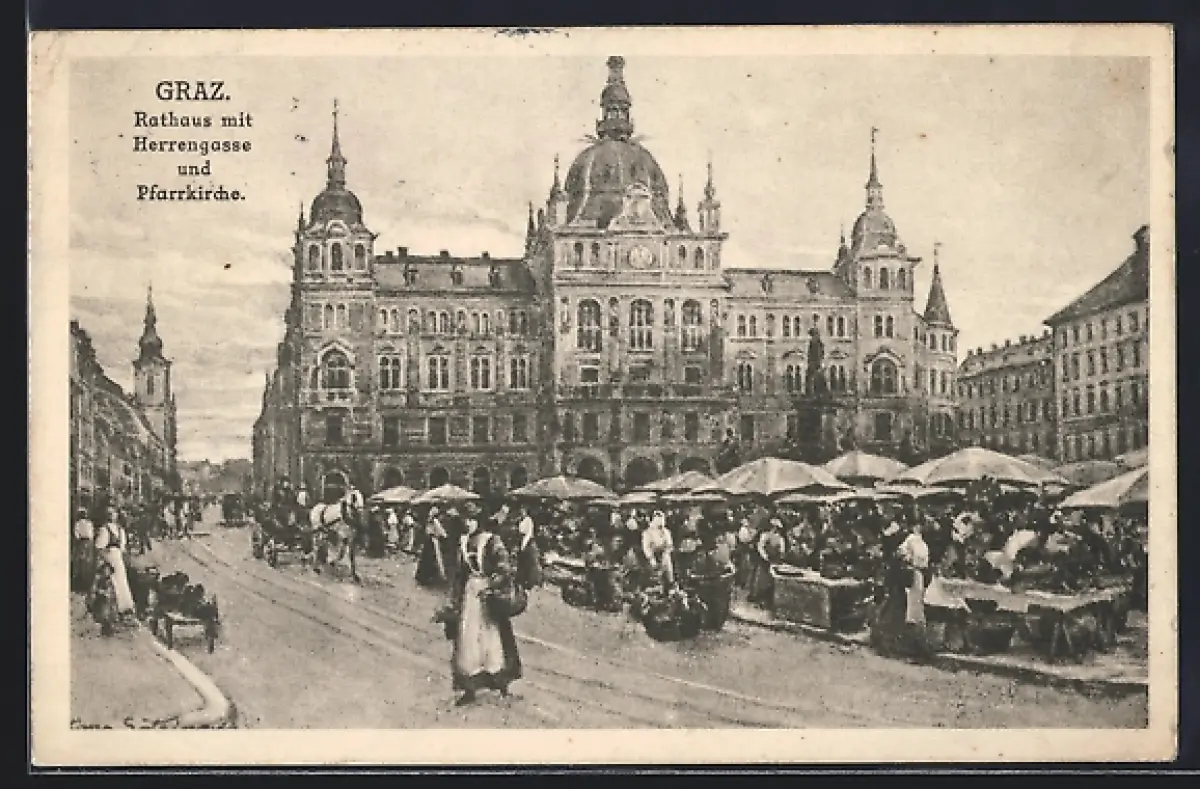 Künstler-AK Hans Götzinger: Graz, Rathaus mit Herrengasse und Pfarrkirche, Markttreiben