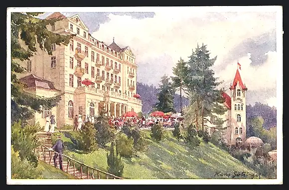 Künstler-AK Hans Götzinger: Marienbad, Hotel Esplanade und Villa Waldidylle
