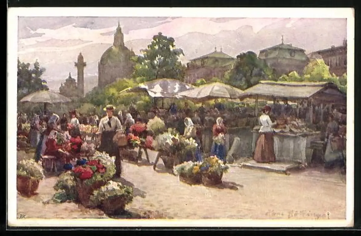 Künstler-AK Hans Götzinger: Wien, Naschmarkt, Marktstände auf dem Marktplatz