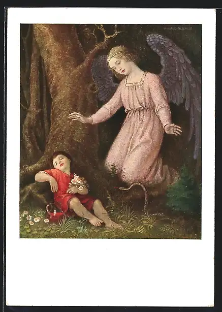 Künstler-AK Hans Huber-Sulzemoos: Engel bewacht schlafenden Jungen